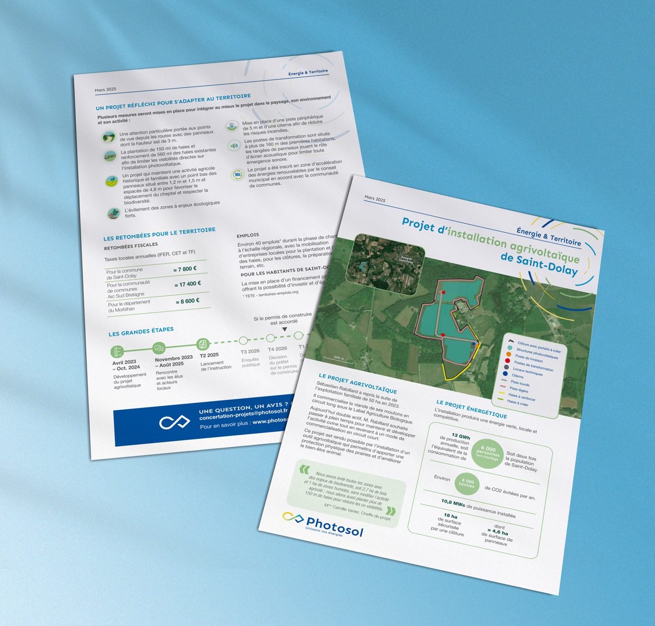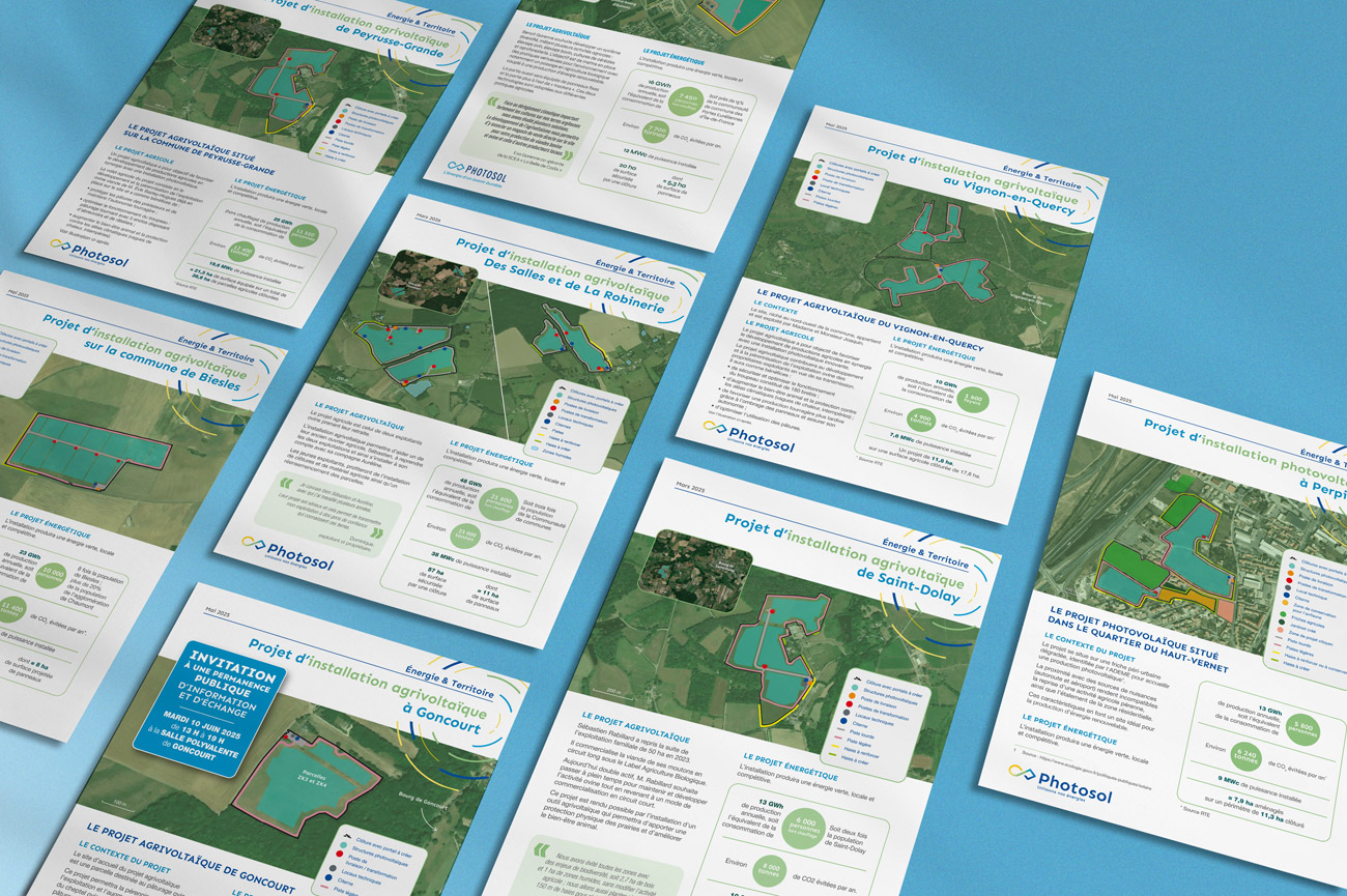 Réalisation de fiches et de dépliants d’information concernant les projets d’installations agrivoltaïques ou photovoltaïques de Photosol (depuis 2024). Exécution de la mise en page et création des cartes géographique illustratives.